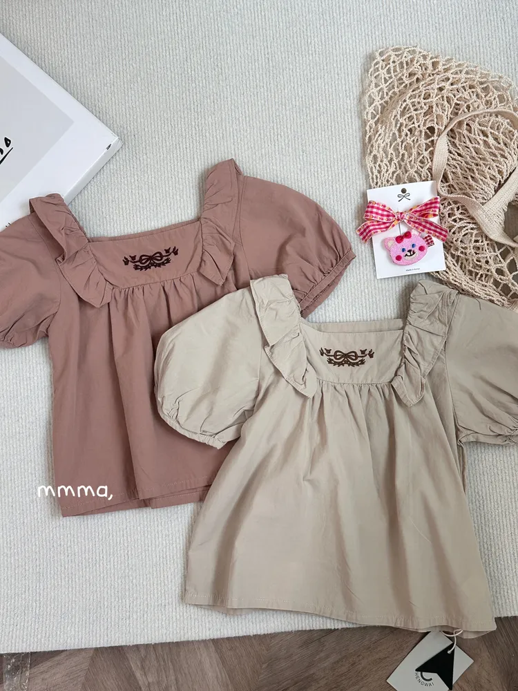 583復古刺繡公主風花邊肩縮口袖上衣(童裝)
