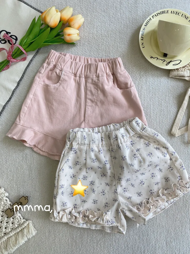 733紫碎花斜紋口袋花邊短褲(童裝)