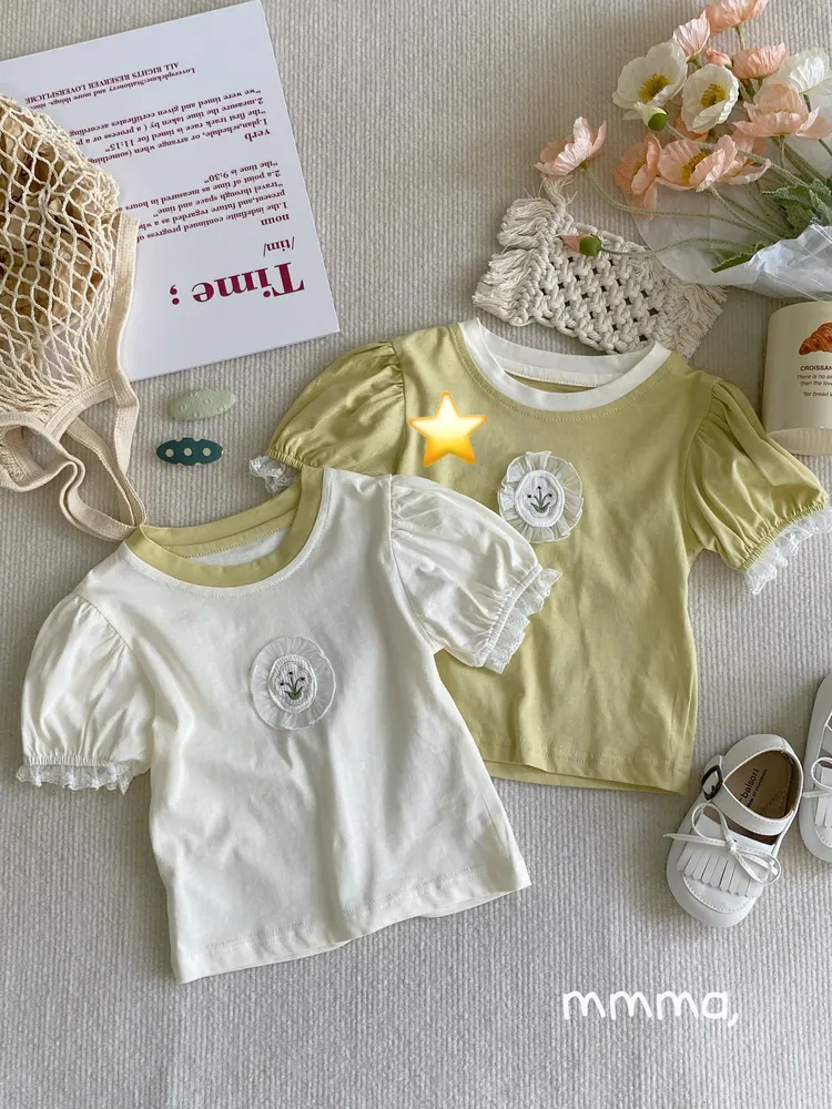 752刺繡花雪紡小標蕾絲花邊袖上衣(童裝)