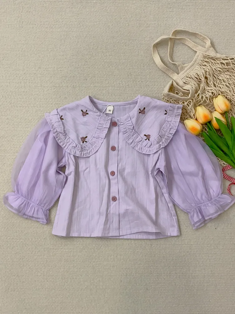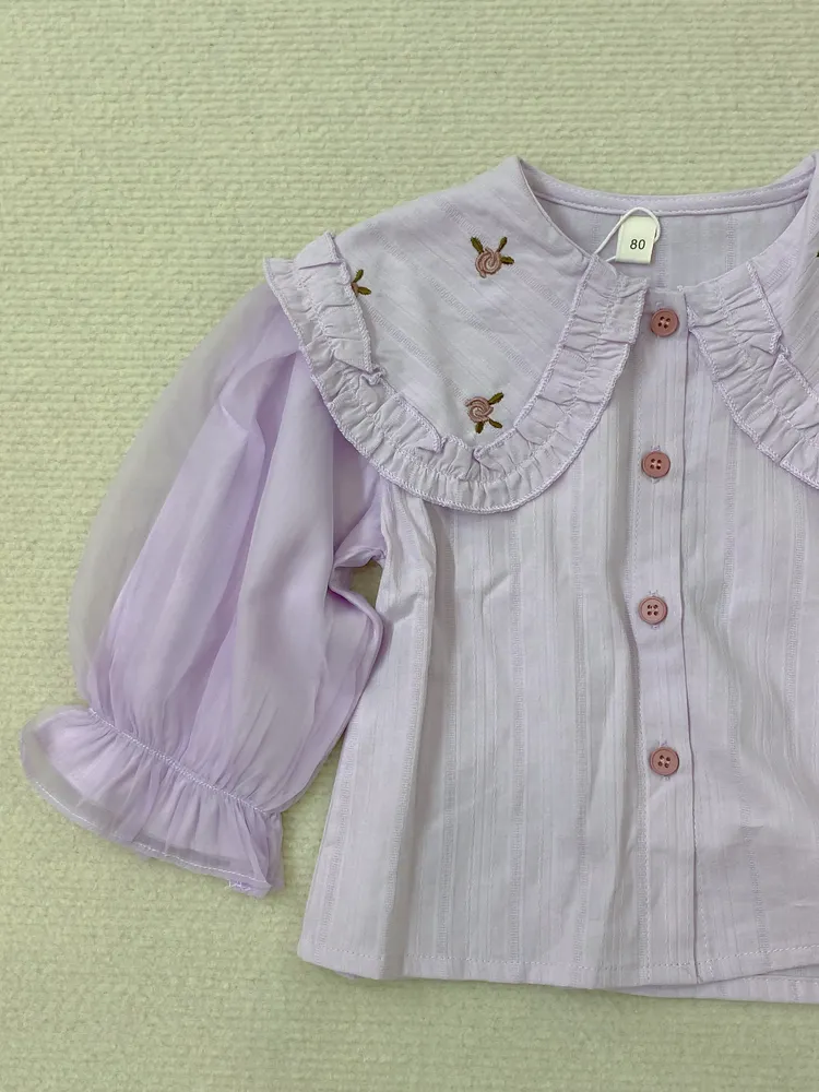 776紫全開釦刺繡花翻領長袖紡紗上衣(童裝)
