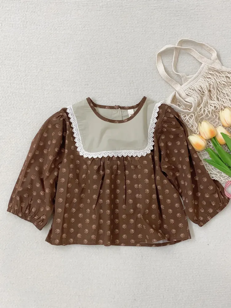 774拼接色蕾絲圍邊滿版印花咖上衣(童裝)