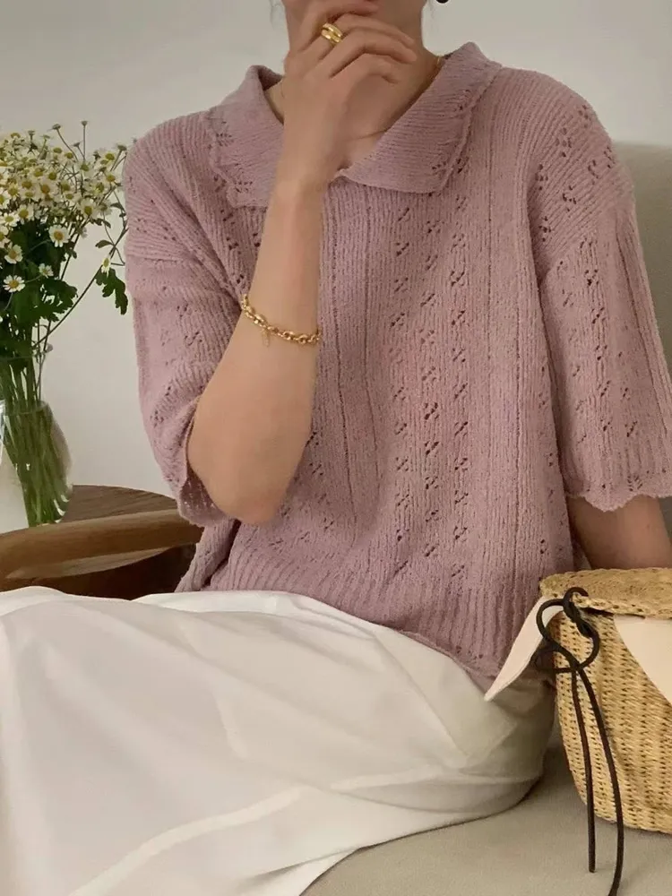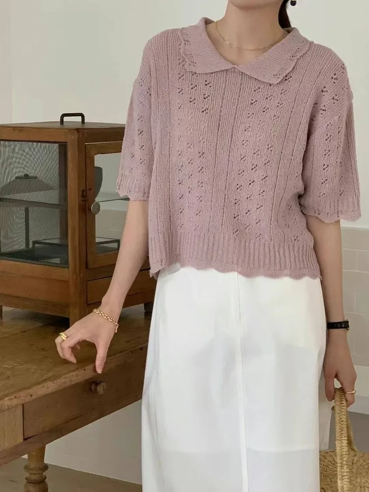W033韓鏤空花邊領針織上衣