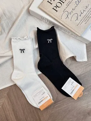 674韓簡約蝴蝶結織紋捲邊中筒襪