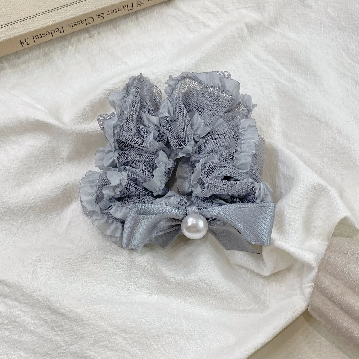 A39韓尼龍拼接網布蝴蝶結珍珠腸圈