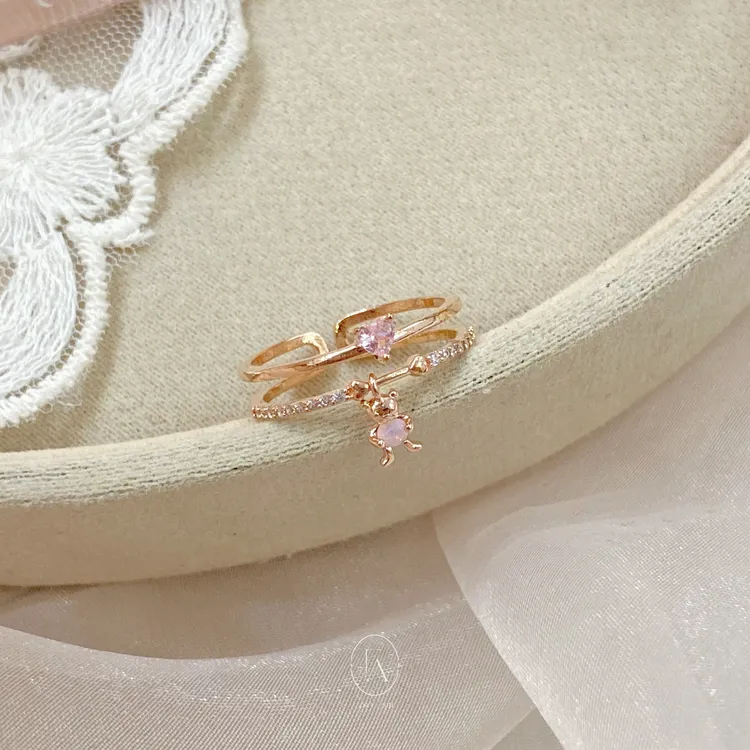 A07雙環愛心垂墜小熊抱鑽戒指
