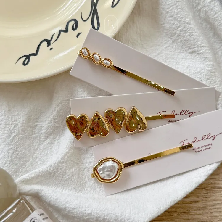 A158韓金色包覆珍珠愛心髮夾(三款)