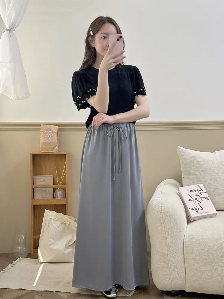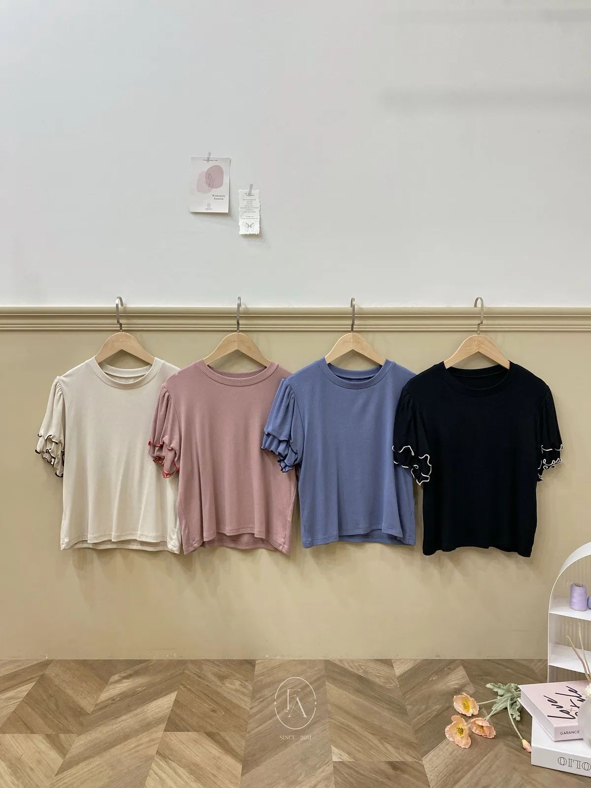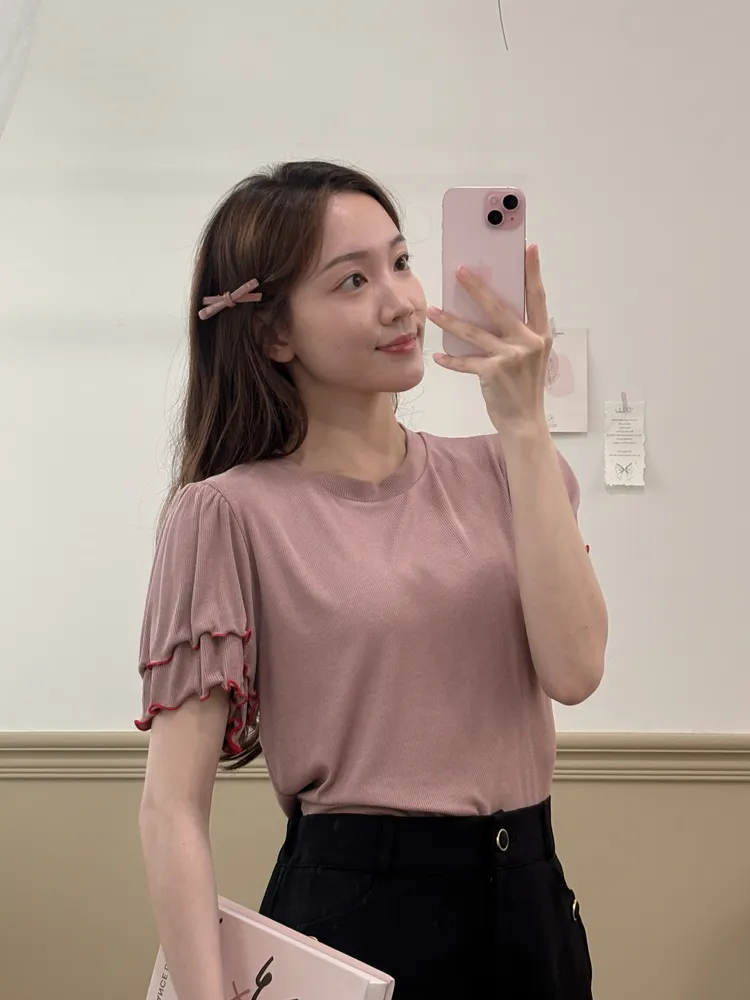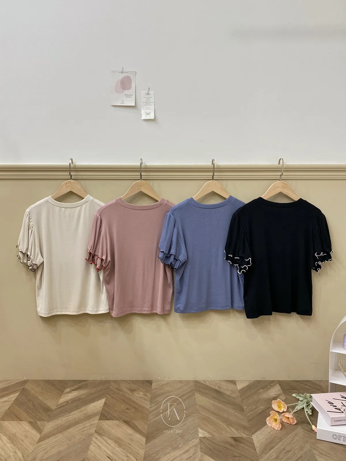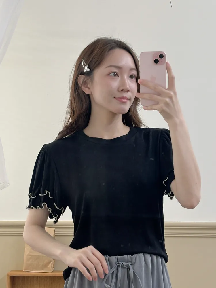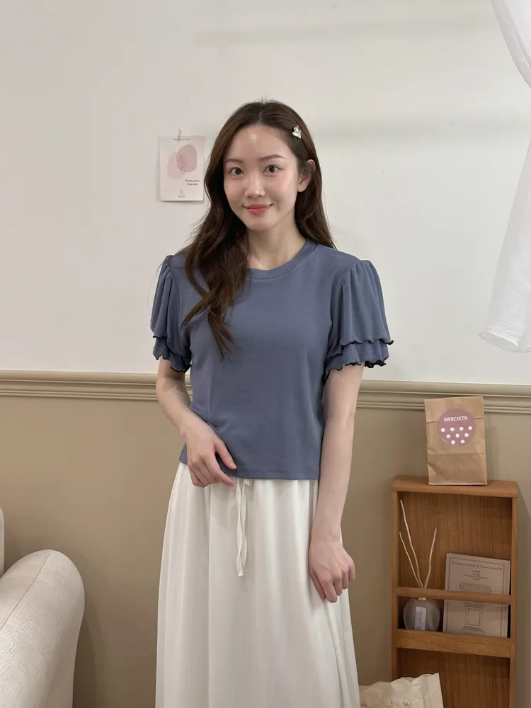 韓浪漫木耳邊雙層袖壓紋上衣(推)
