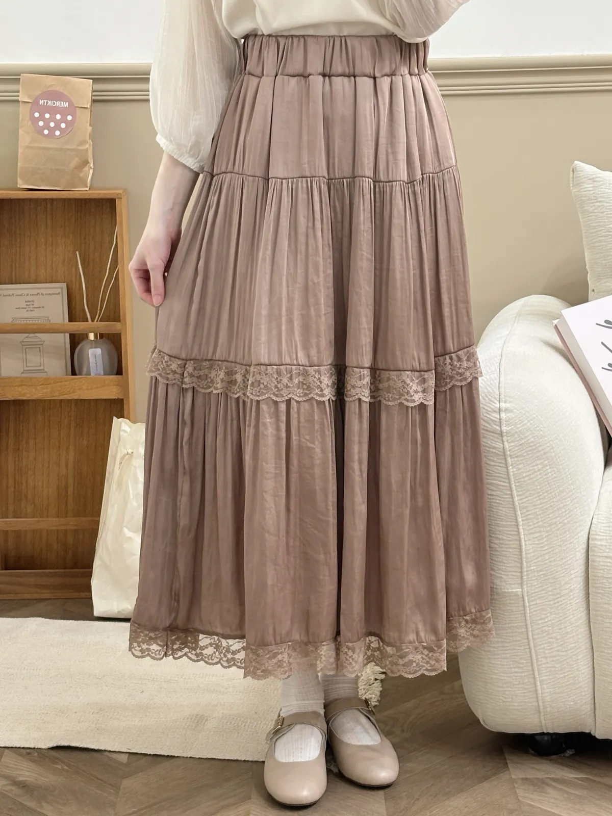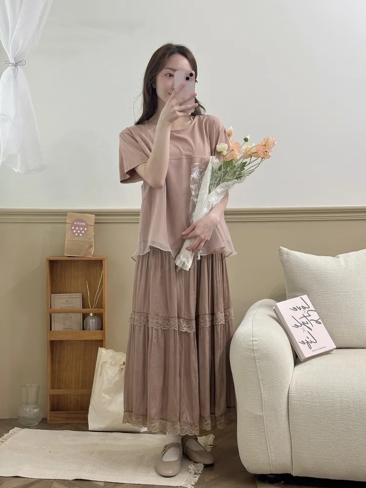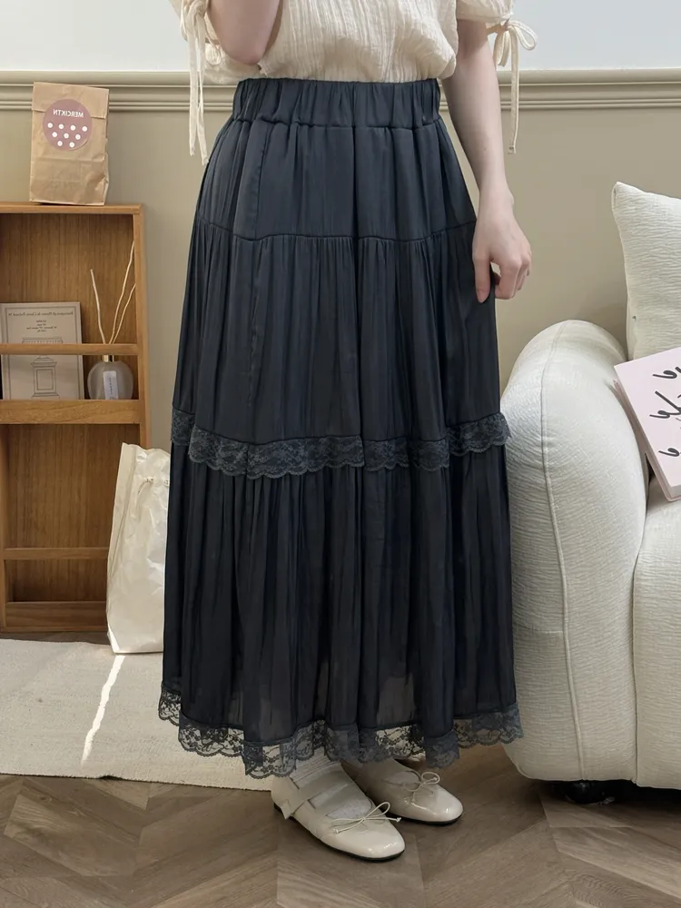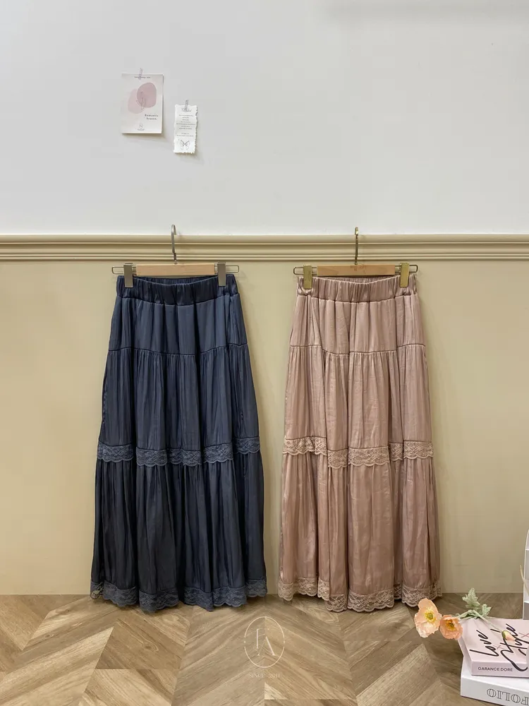韓溫柔拼接蕾絲花邊緞面長裙