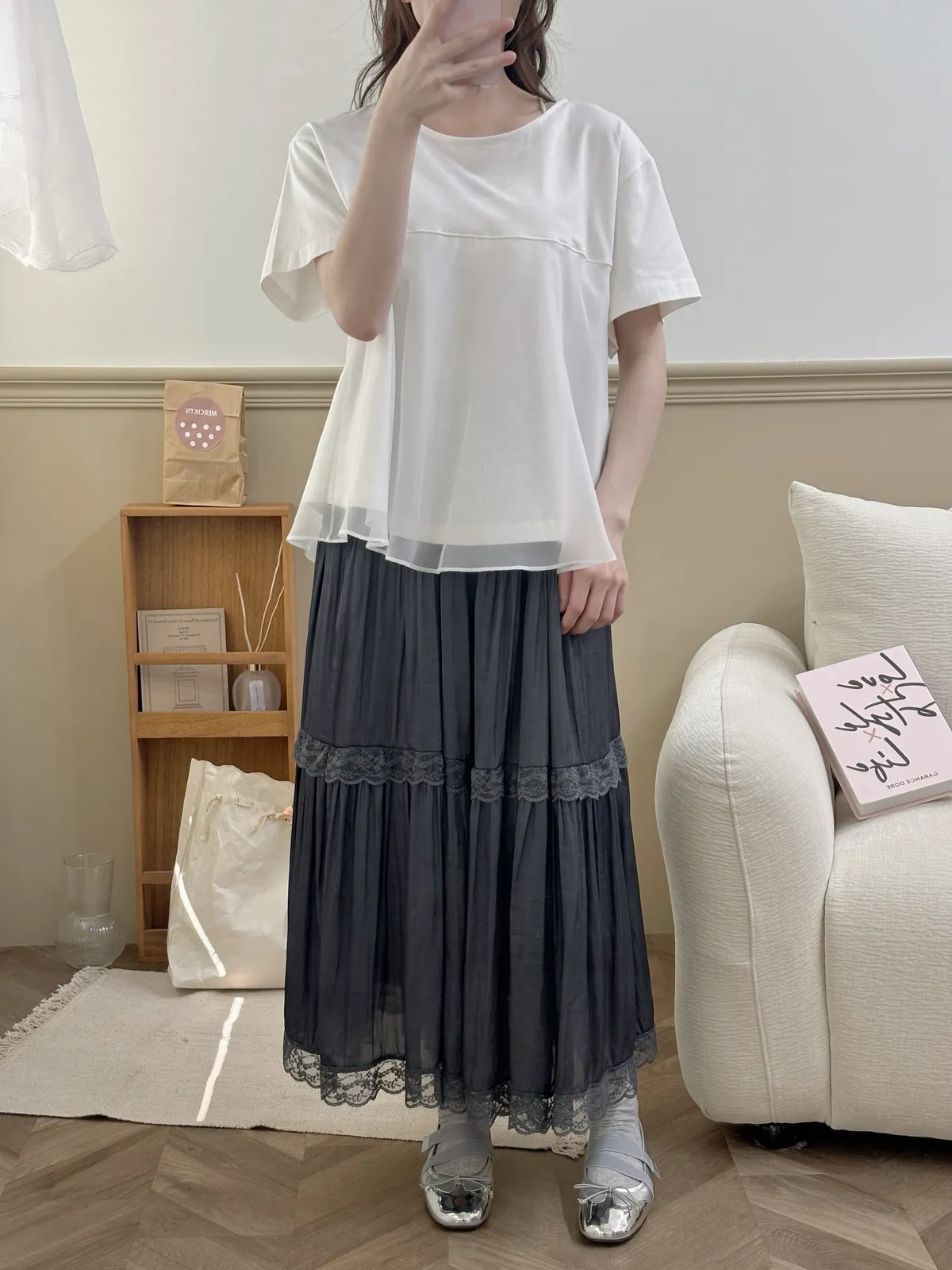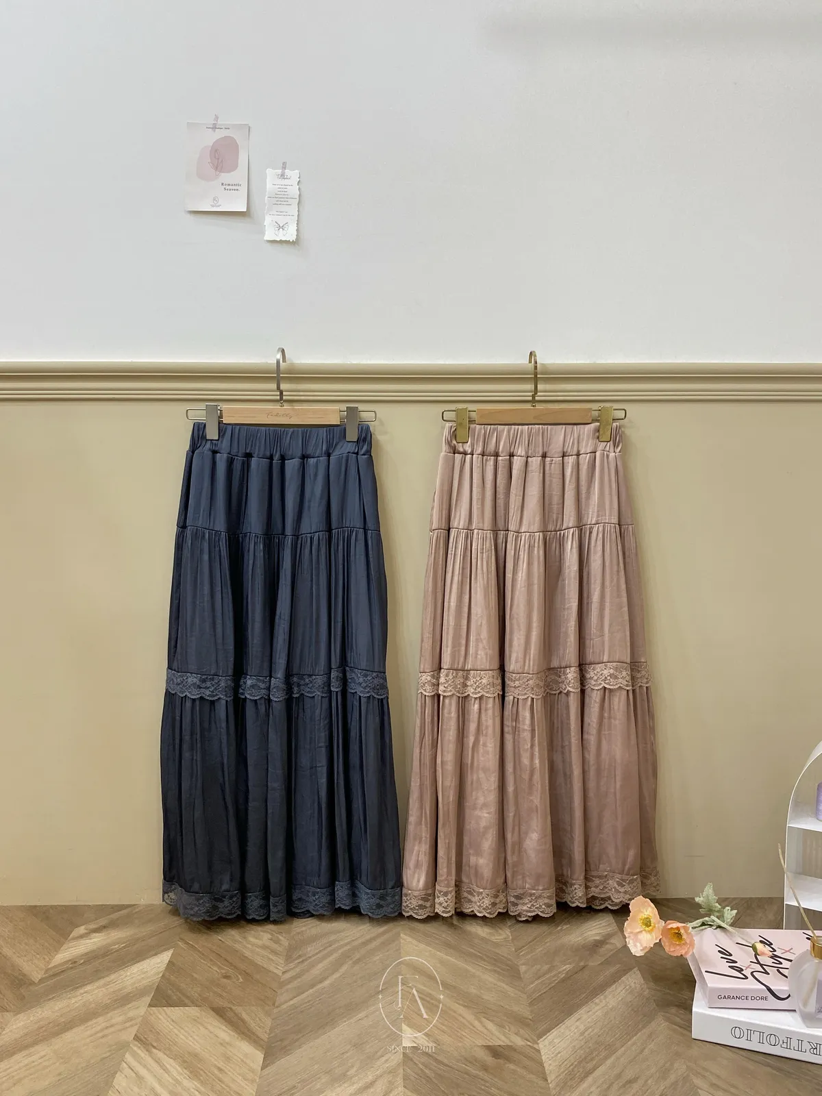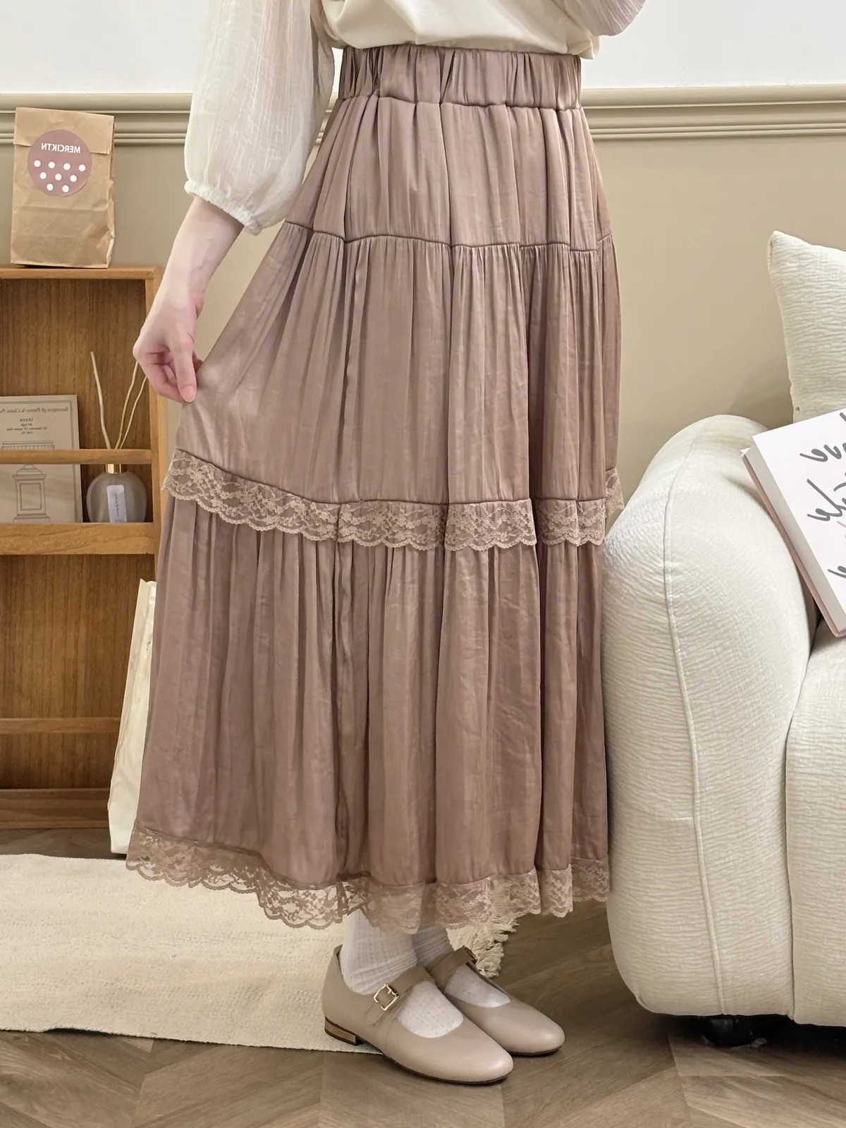 韓溫柔拼接蕾絲花邊緞面長裙