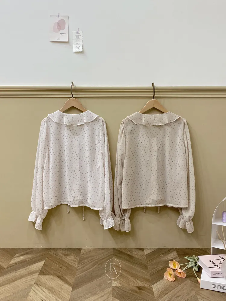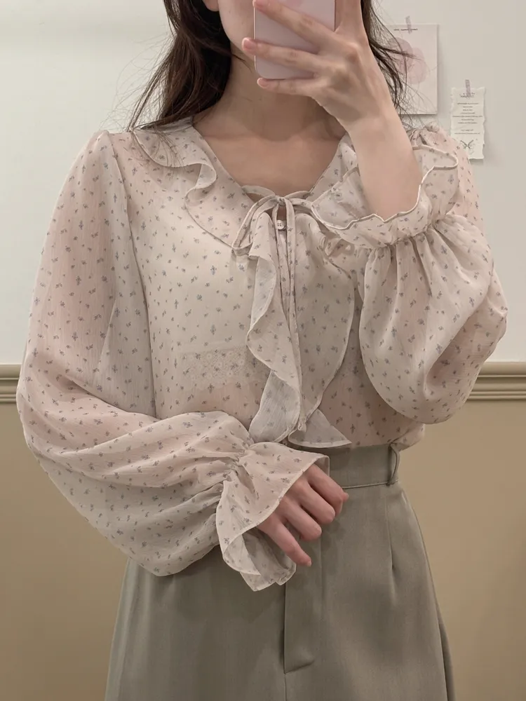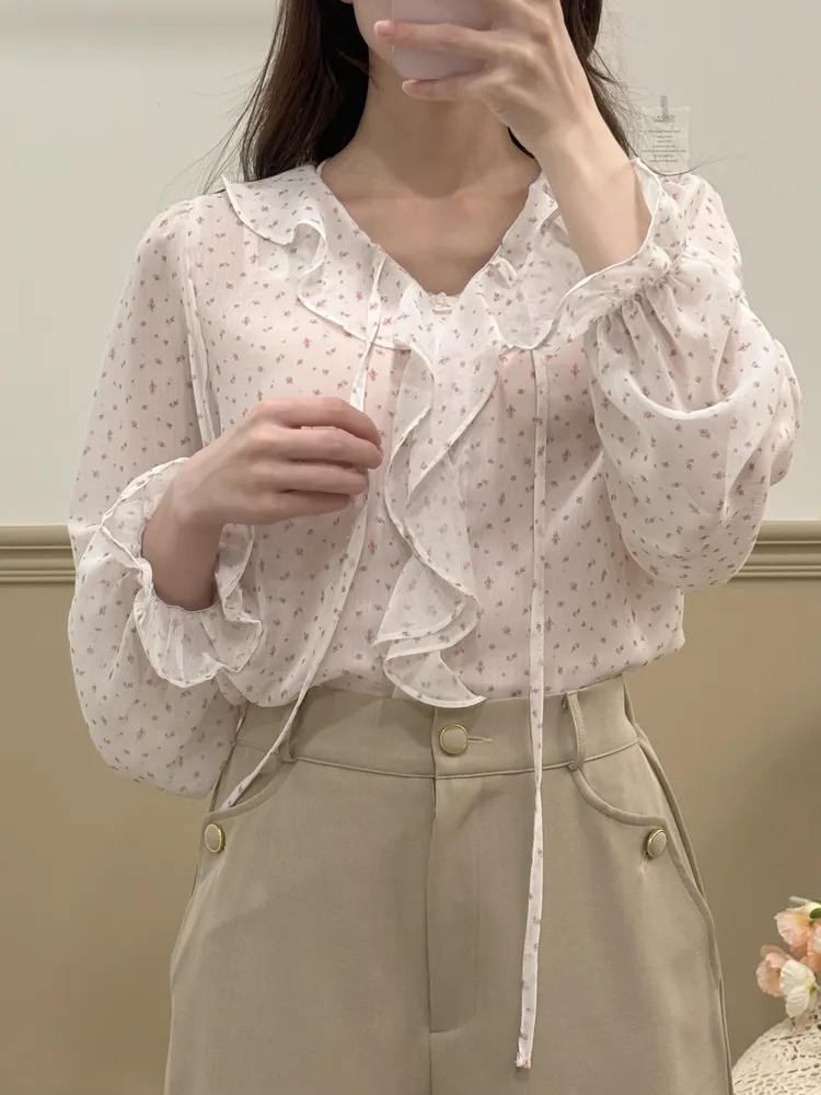 韓浪漫碎花綁繩花邊雪紡上衣(推)