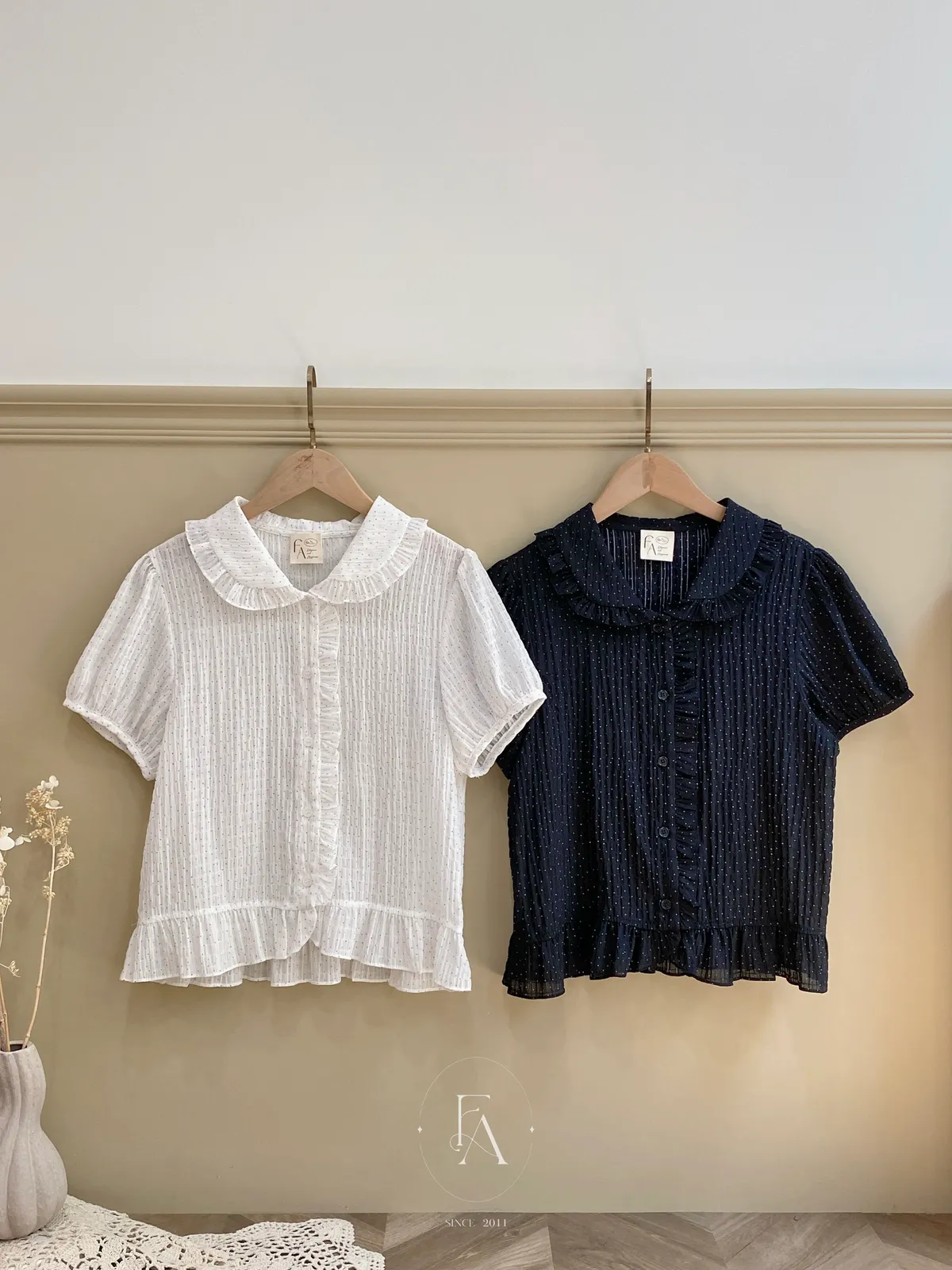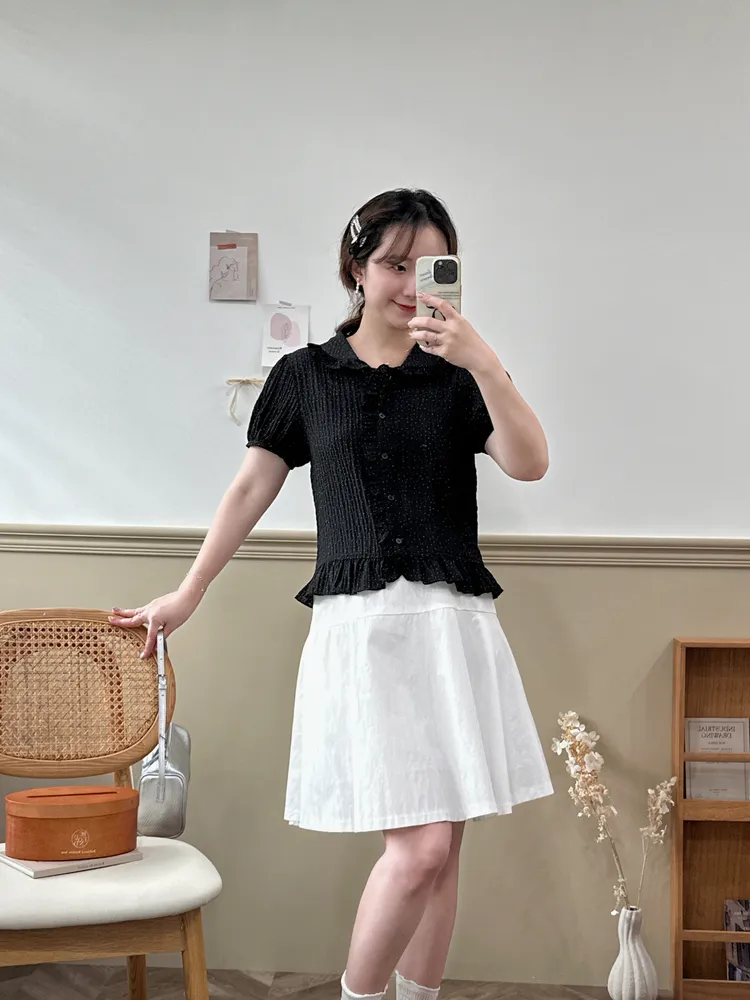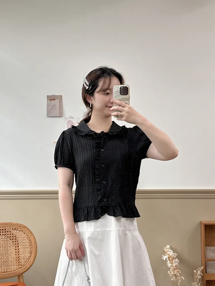 020韓小圓點褶皺木耳邊上衣