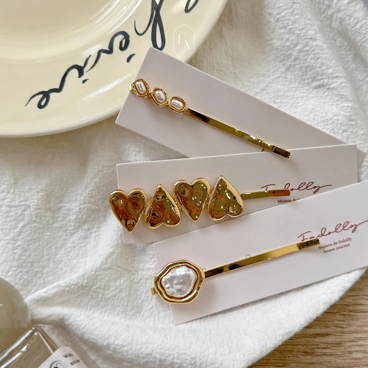 C16韓金色包覆珍珠愛心髮夾